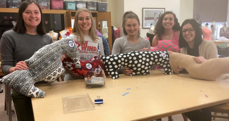 Pillows for Cancer – “One of our directors had a mastectomy some years ago. And after she went in for surgery, she was given a special pillow. The shape is just right to hug. You know how after you’ve had surgery you just hug it because it helps the pain go away.” Sister Mollica has her Kappa Omicron Nu students make pillows to give to patients facing cancer treatment and other major surgery.In November Sister Mollica and the KON students make approximately 10-15 pillows. Using donated fleece fabric, both leftovers from projects with fashion students and other fabric donations, they cut and sew pillows of different styles and stuff them with poly-fil. She started out with a heart shape and moved on to the mastectomy armpit pillow shape. The university logo is sewn on to the pillows to remind the patients that someone is thinking of them. After the pillows are completed, the students bring them to the director who distributes the pillows to organizations such as the HERS Foundation: Hysterectomy Alternatives and Aftereffects, and breast cancer and heart patients at a local hospital.